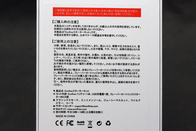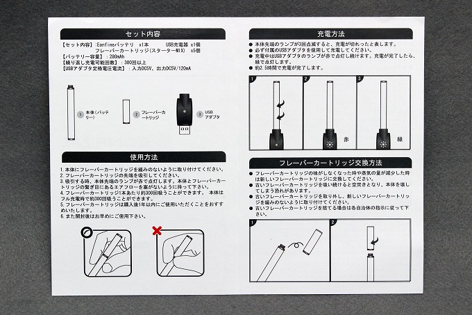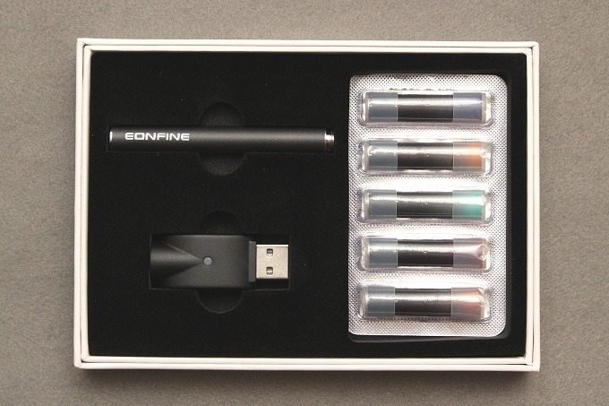 バッテリー部分と、充電器と、煙の素(カートリッジ)5本がセットになっています。