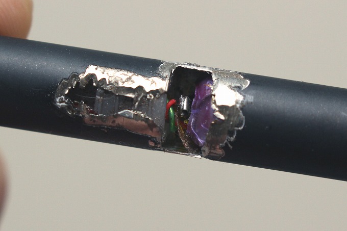 (↑以前分解した時の写真) 電池の両極の位置を予想して、筒に穴を開けることにしました。
