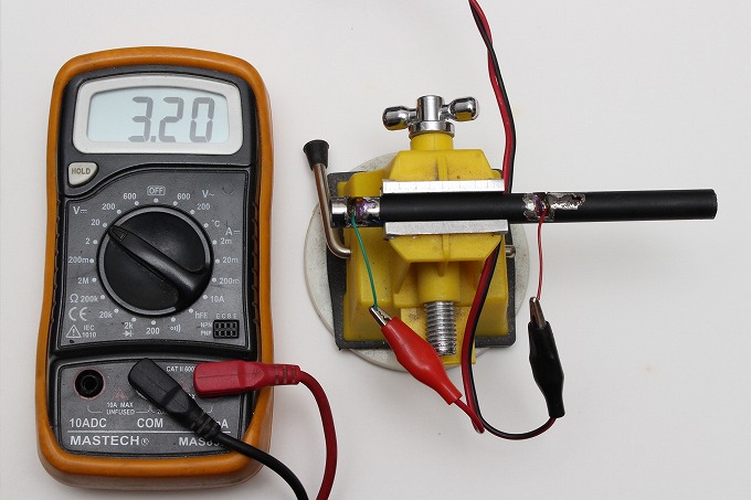 電圧を測ると、3.2Vありました。(でもニクロム線には電流が流れません。)