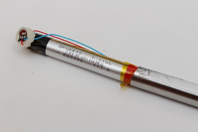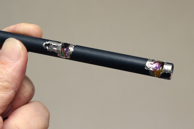 数年前に使い捨て電子タバコを分解したので中がどうなっているのかは大体分かっています。先端のLED・スイッチの横(後ろ)に電池が入っているはず。電池は先端側がマイナスです。