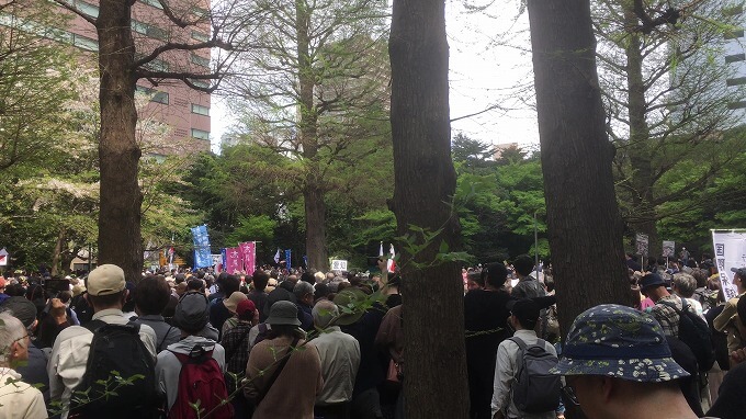 集合時間の10分前に到着したけど、東池袋中央公園はすでに満員。私は公園入口付近でシュプレヒコールを上げていました。