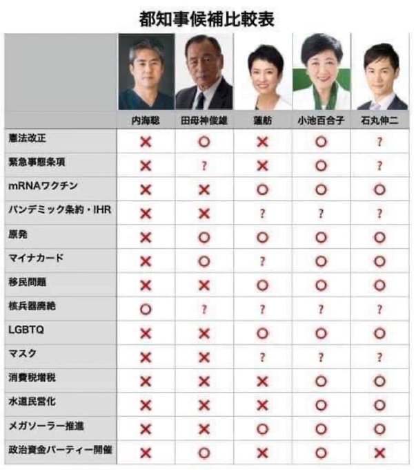 東京都民の幸せを第一に考えるなら、mRNAワクチン、移民問題、水道民営化、メガソーラーあたりの考え方が都知事を選ぶ重要なポイントになると思う。