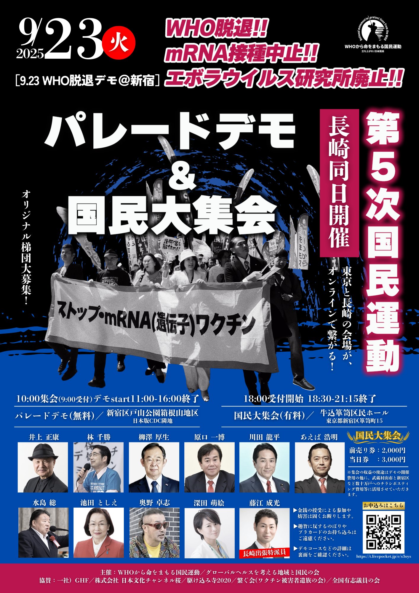 2025年9月23日はWHO脱退を要求するデモが行われます。日本が滅茶苦茶にされる前に、意思を示し、国民世論を高めましょう!!