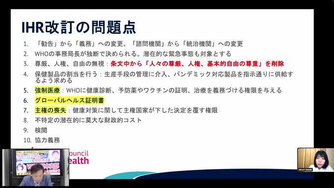 世界中の多くの人は気づき始めています。WHOが来年5月に改定しようとしているIHRについては右とか左とか関係ない話です。主権を守るかどうかです。